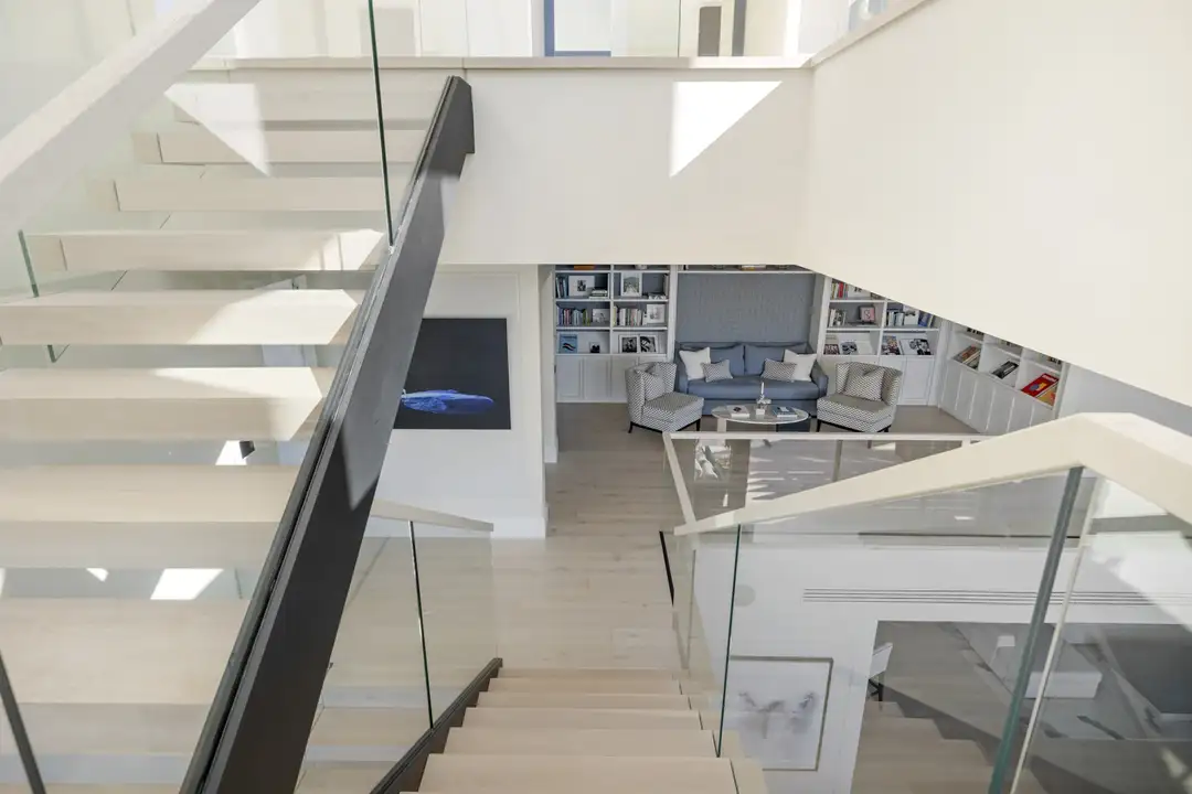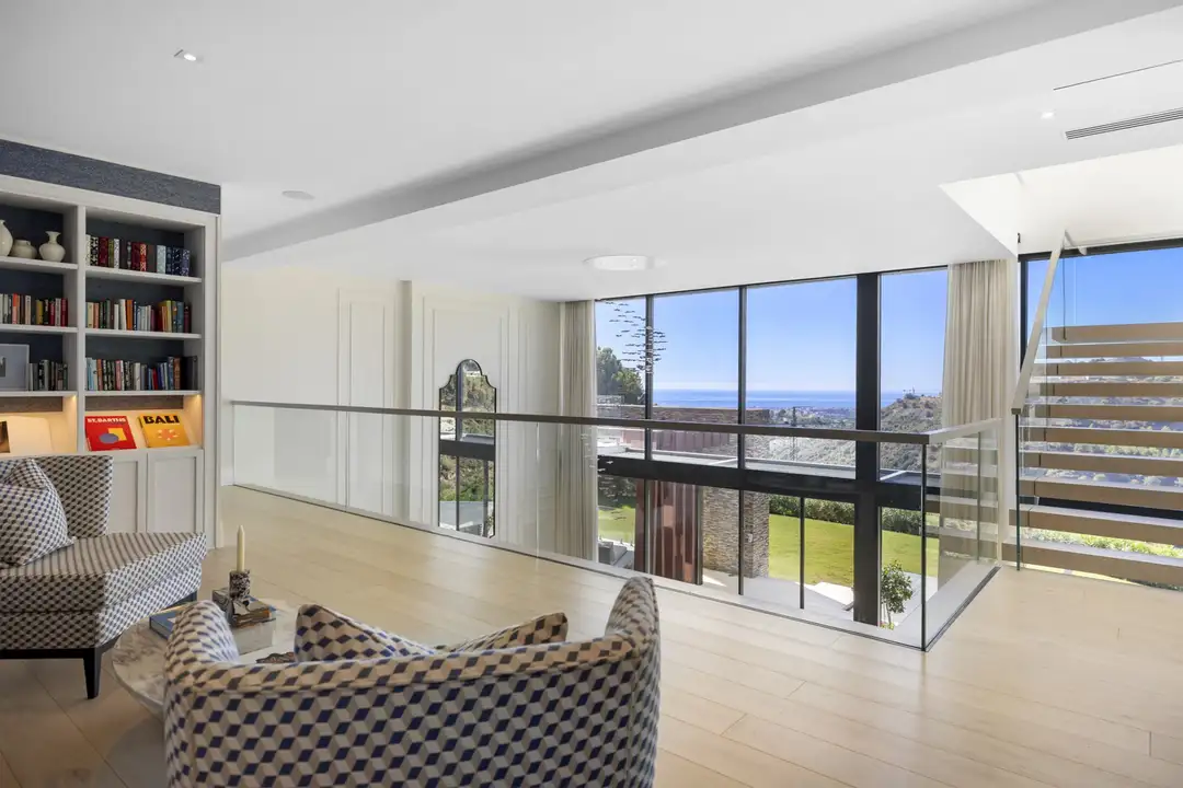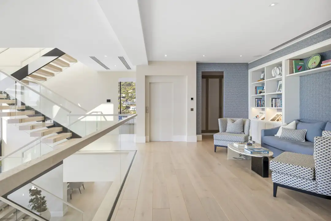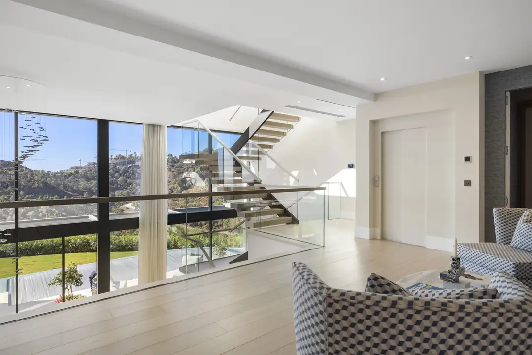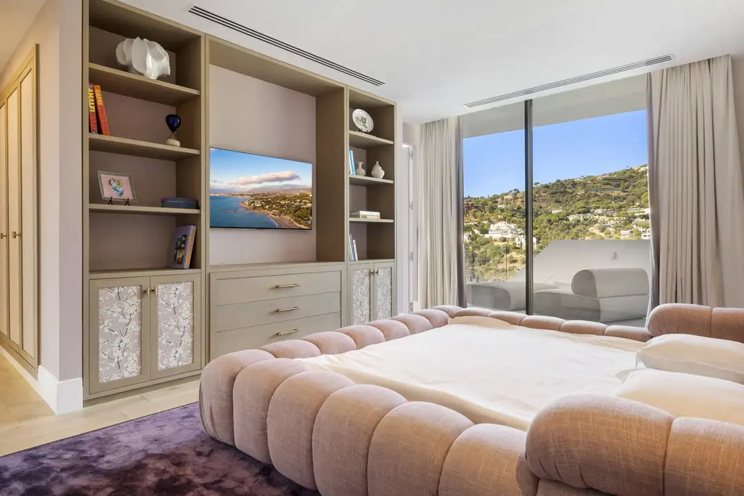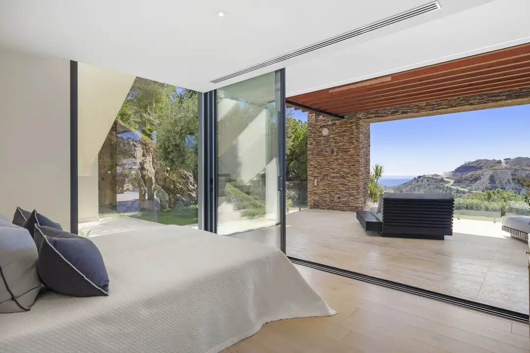 On the second floor you will find 2 bedrooms that are connected in the middle with a fully Italian marble bathroom with a shower. Both bedrooms enjoy a spacious terrace with wonderful mountain views. The bedrooms have black out curtains and electric blinds. On the other side of the floor, you will find the main bedroom en-suite with a full Italian imported marble bath for 2 and a spa style shower for 2 with a private terrace with views to the sea and mountains. For those who like to watch TV in bed there’s a big flatscreen smart TV. Also, on the same floor you can find a sitting area with a library that overlooks the sea and mountains. Large windows from 8 meters high that cover the first and second floor, giving the property lots of light.