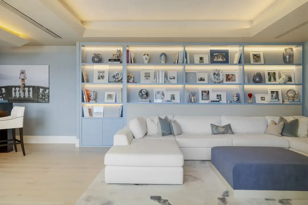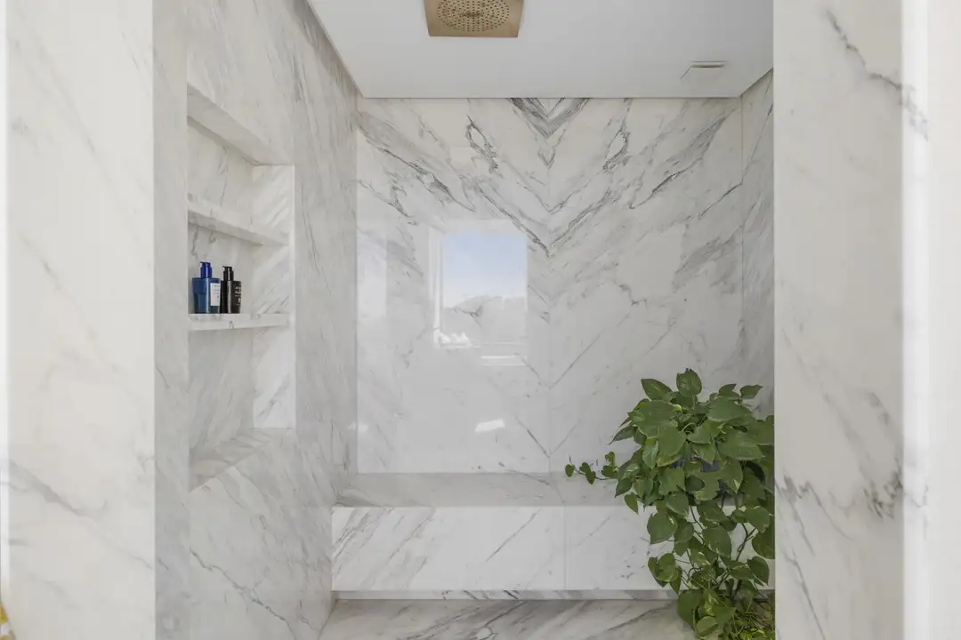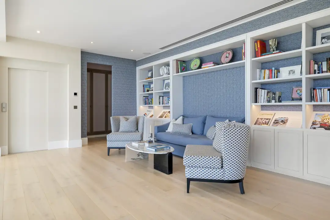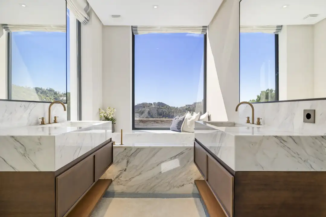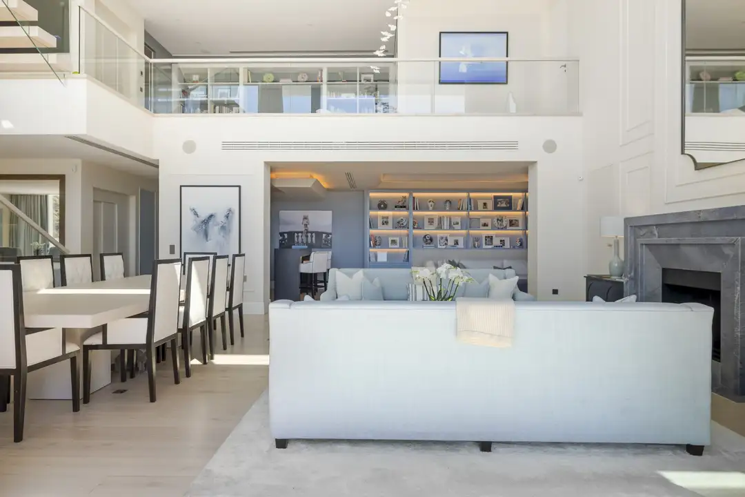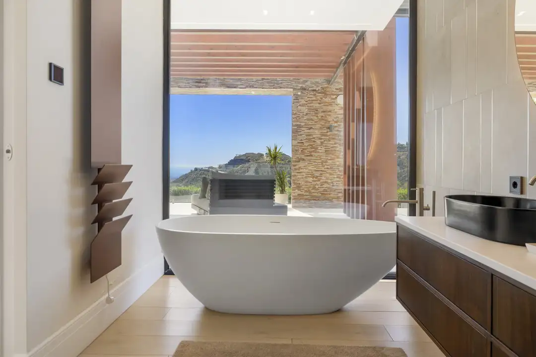 On the second floor you will find 2 bedrooms that are connected in the middle with a fully Italian marble bathroom with a shower. Both bedrooms enjoy a spacious terrace with wonderful mountain views. The bedrooms have black out curtains and electric blinds. On the other side of the floor, you will find the main bedroom en-suite with a full Italian imported marble bath for 2 and a spa style shower for 2 with a private terrace with views to the sea and mountains. For those who like to watch TV in bed there’s a big flatscreen smart TV. Also, on the same floor you can find a sitting area with a library that overlooks the sea and mountains. Large windows from 8 meters high that cover the first and second floor, giving the property lots of light.