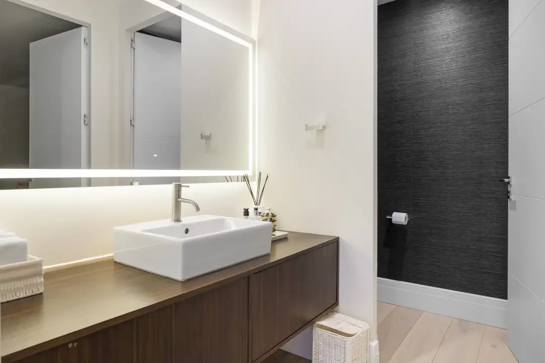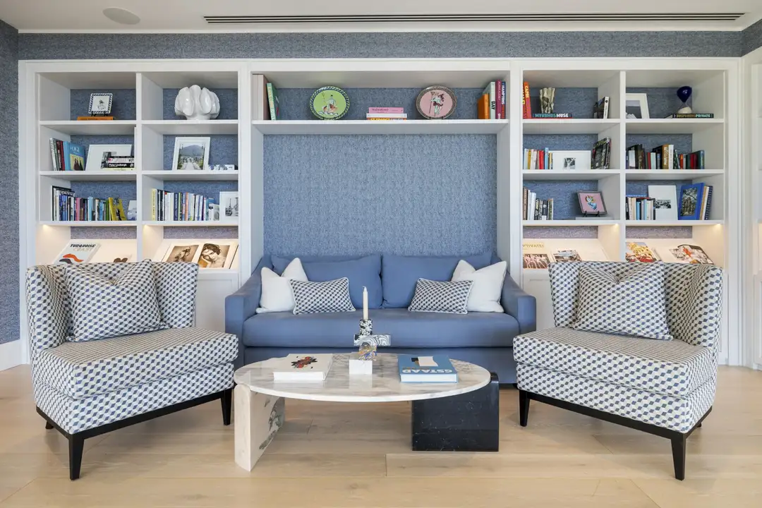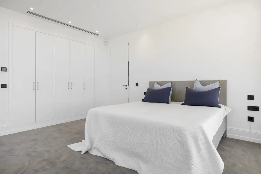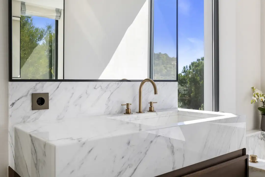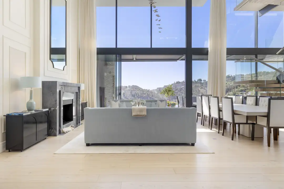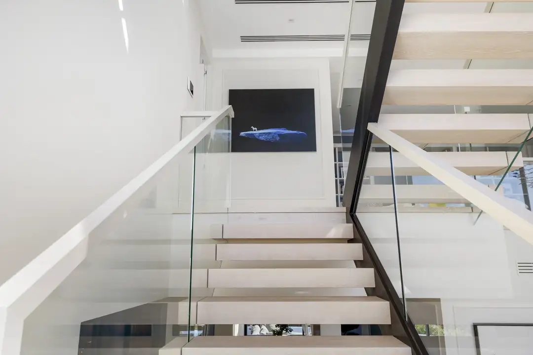 On the second floor you will find 2 bedrooms that are connected in the middle with a fully Italian marble bathroom with a shower. Both bedrooms enjoy a spacious terrace with wonderful mountain views. The bedrooms have black out curtains and electric blinds. On the other side of the floor, you will find the main bedroom en-suite with a full Italian imported marble bath for 2 and a spa style shower for 2 with a private terrace with views to the sea and mountains. For those who like to watch TV in bed there’s a big flatscreen smart TV. Also, on the same floor you can find a sitting area with a library that overlooks the sea and mountains. Large windows from 8 meters high that cover the first and second floor, giving the property lots of light.