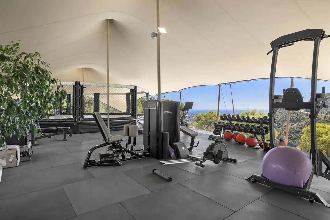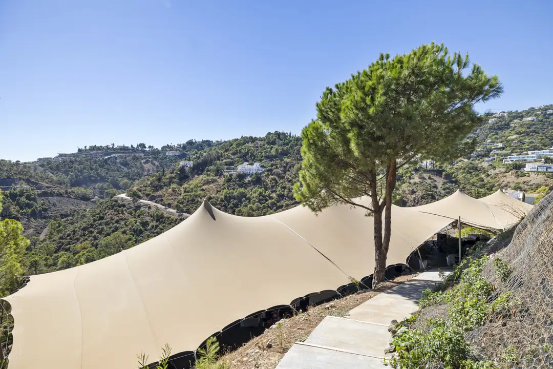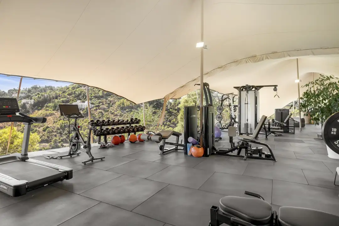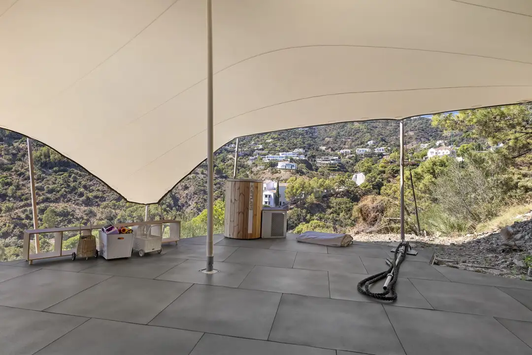 As you walk on the terrace that connects the living, bedroom and kitchen area you will find a seating area with a big modern sofa, to enjoy the garden and views as well as the heated pool. Sunshades cover the seating area. You can find all sorts of fruit trees in the garden. There’s a path at the end of the garden that brings you to an exceptional feature of the house, the outdoor gym, covered with a tent straight out of the savanna of Africa.