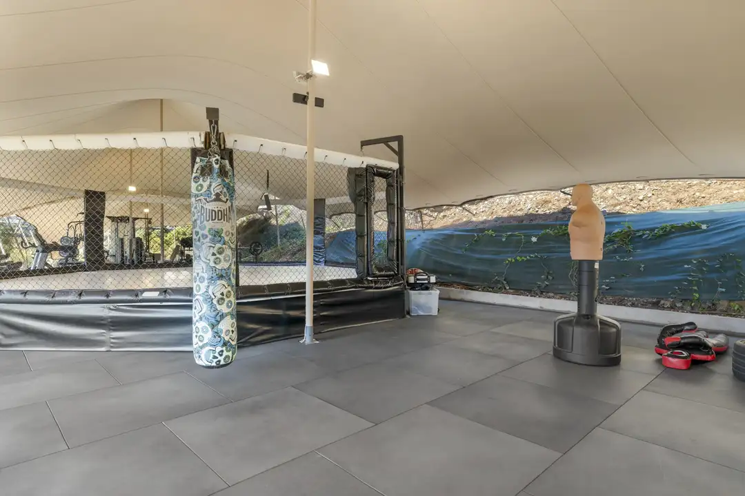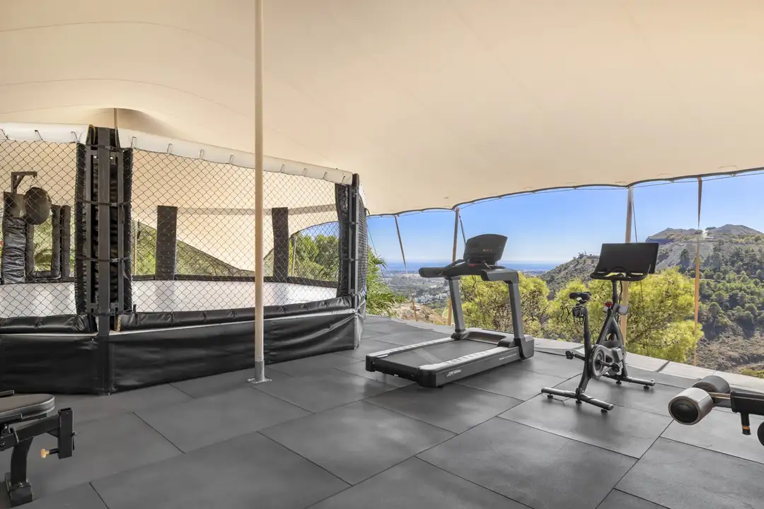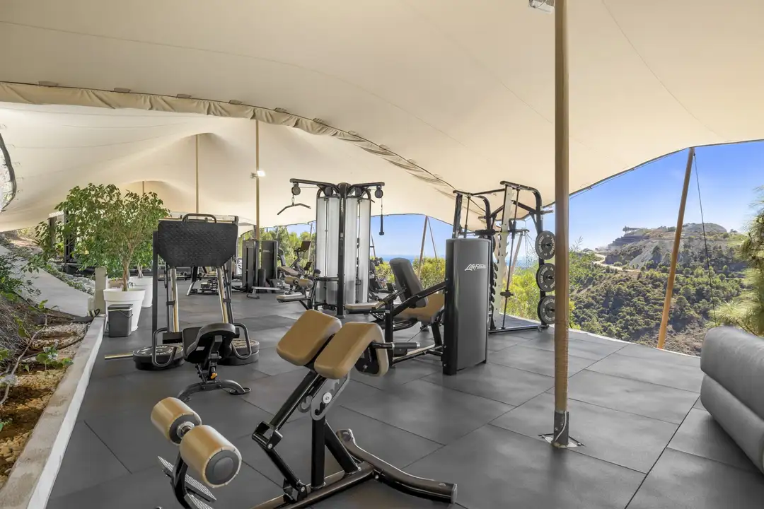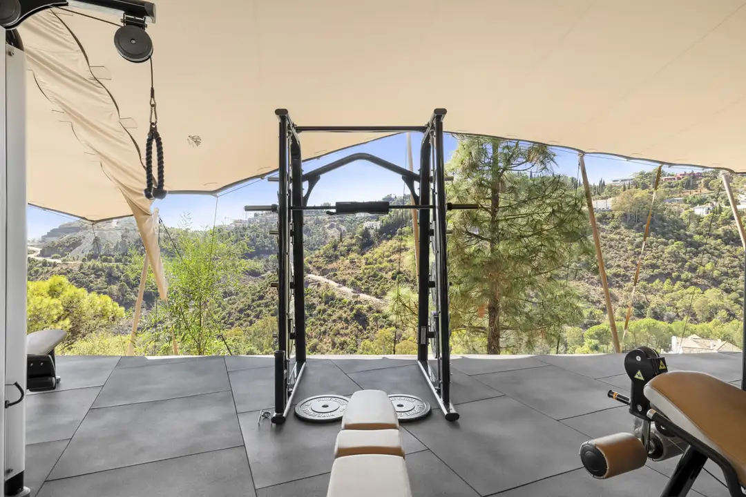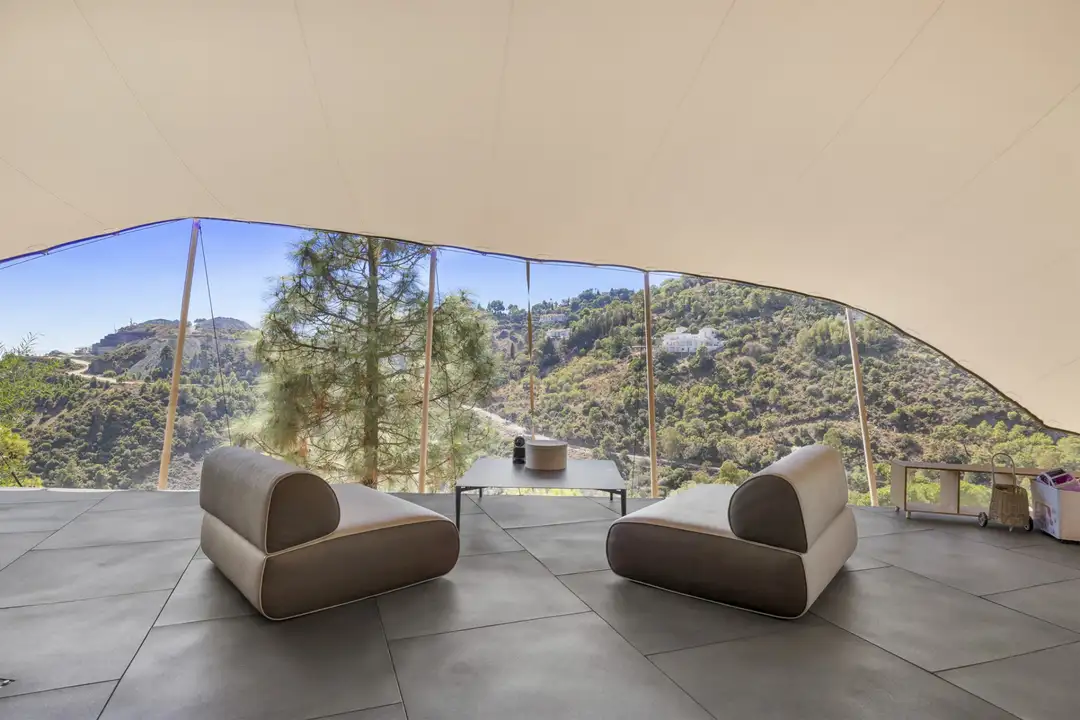 As you walk on the terrace that connects the living, bedroom and kitchen area you will find a seating area with a big modern sofa, to enjoy the garden and views as well as the heated pool. Sunshades cover the seating area. You can find all sorts of fruit trees in the garden. There’s a path at the end of the garden that brings you to an exceptional feature of the house, the outdoor gym, covered with a tent straight out of the savanna of Africa.