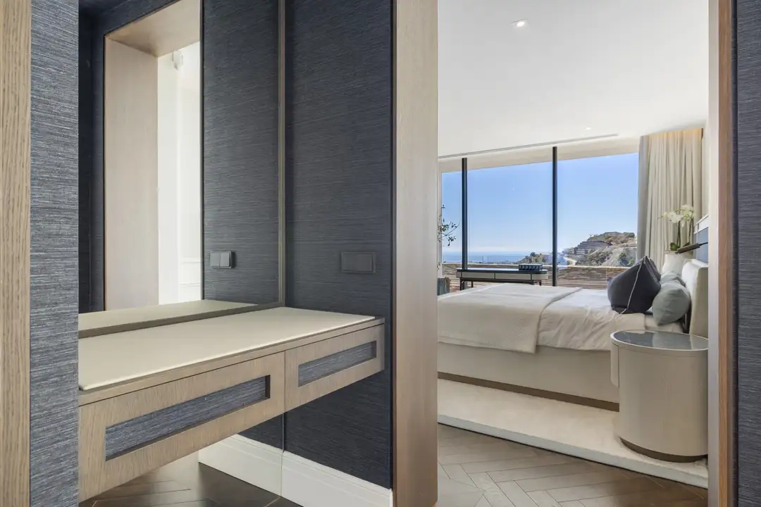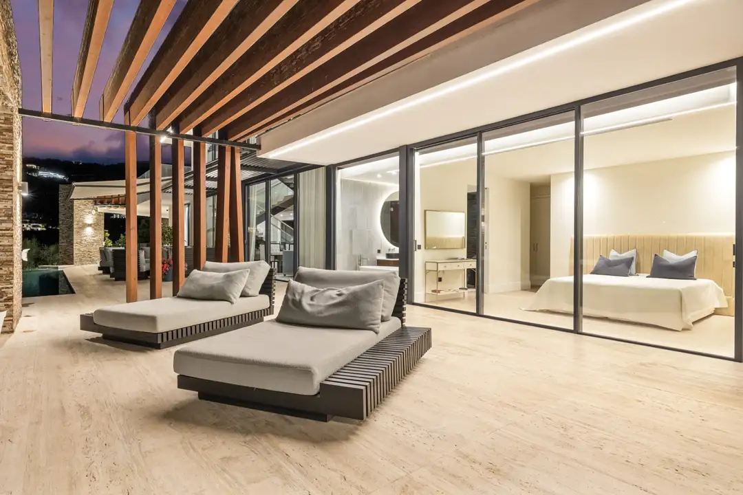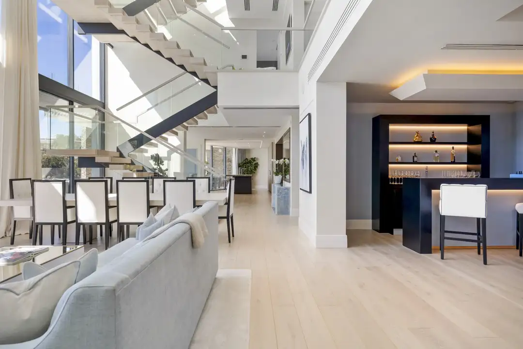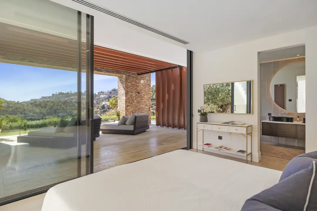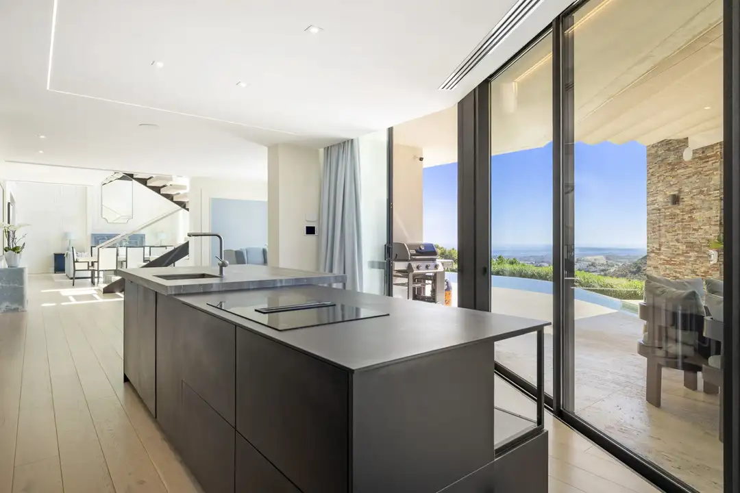 The modern open plan kitchen and luxury finishes reflect sophistication and practicality. The five bedrooms, each with a unique design, feature a master suite that includes a dressing room, spa-style bathroom and private terrace with stunning views.