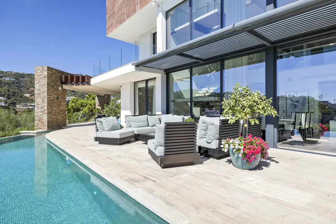 The luxury villa stands as a three-storey residence designed by a renowned architect. It offers five bedrooms of which 4 en-suite bathrooms, and a guest toilet. Its south/southwest-facing orientation guarantees panoramic views of the sea, the mountains and the swimming pool, which blend in with the serenity of its surroundings.