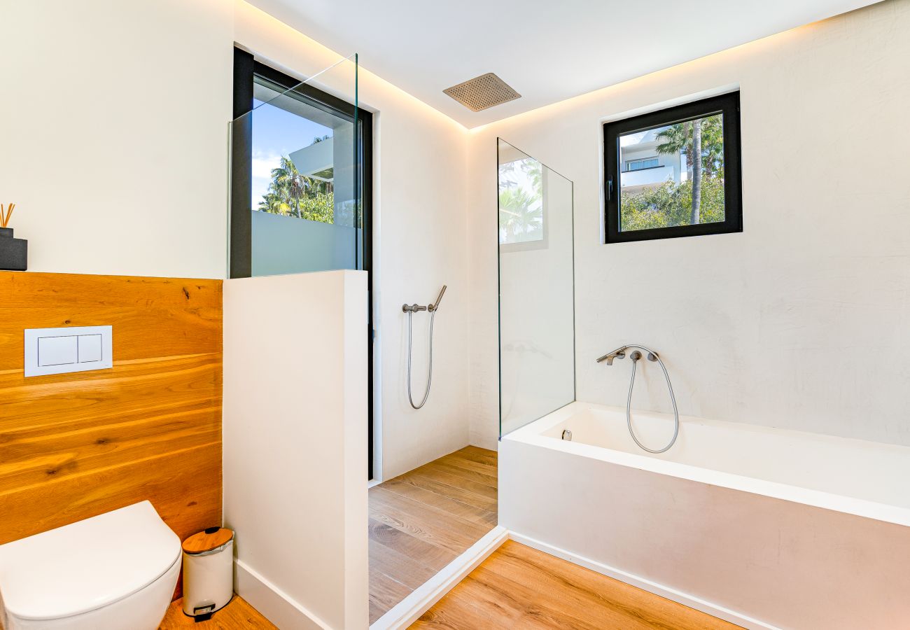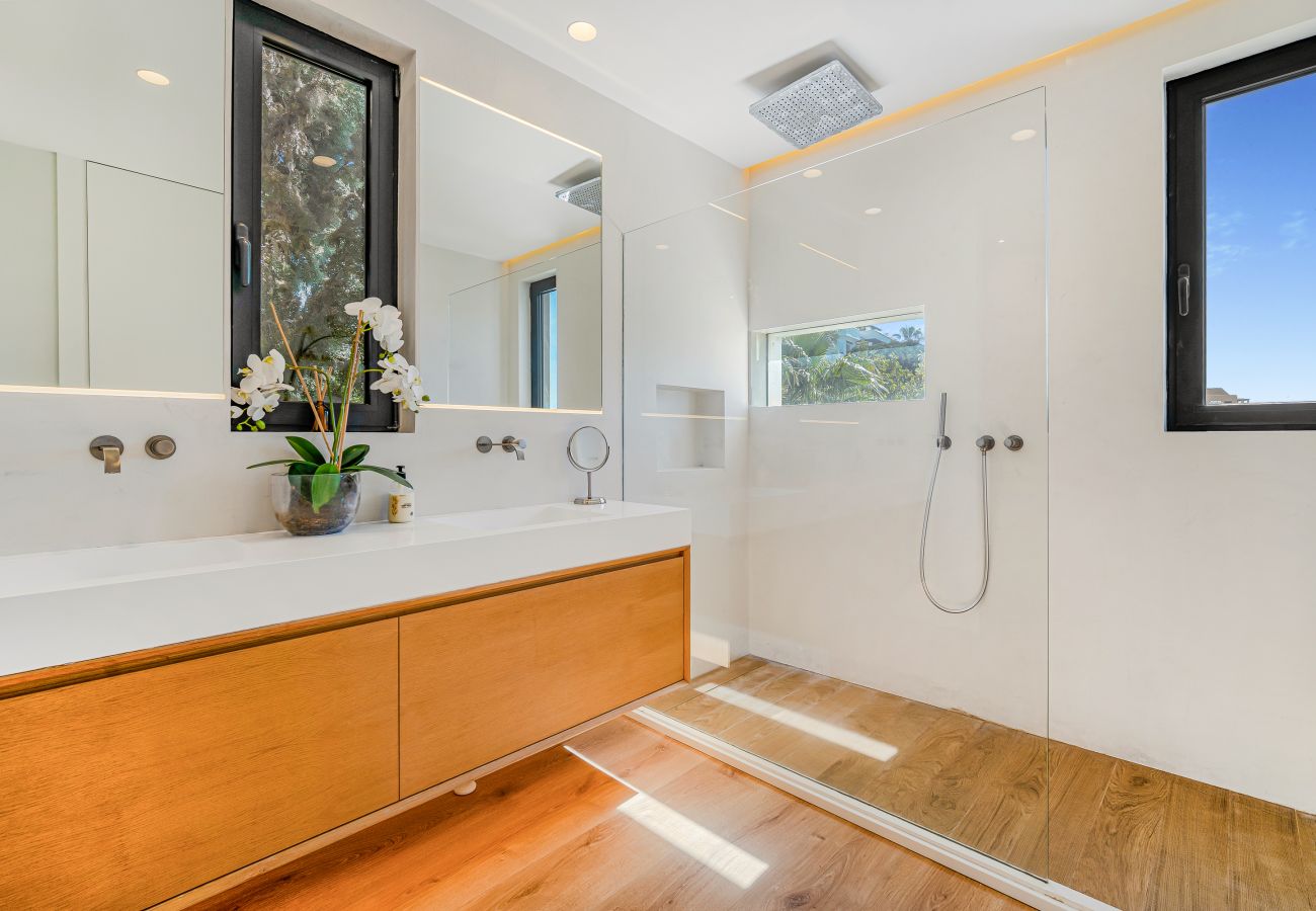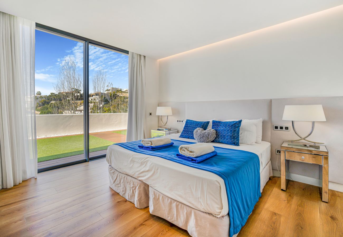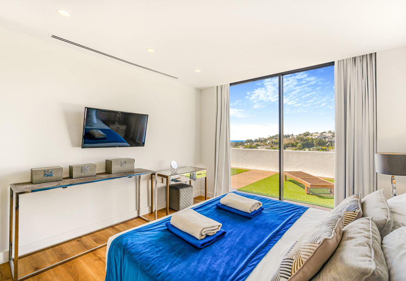 The upper floor is home to the luxurious master suite and two further guest bedrooms, all featuring walk-in wardrobes and dressing areas. A shared, well-appointed bathroom serves the guest rooms. Each bedroom has direct access to a panoramic terrace that spans the length of the villa—perfect for unwinding in the jacuzzi or refreshing in the outdoor shower while taking in the stunning scenery.