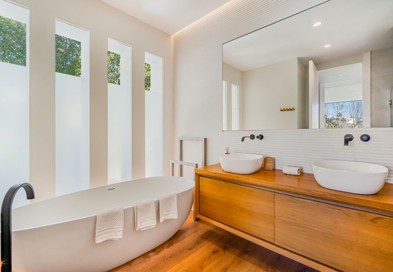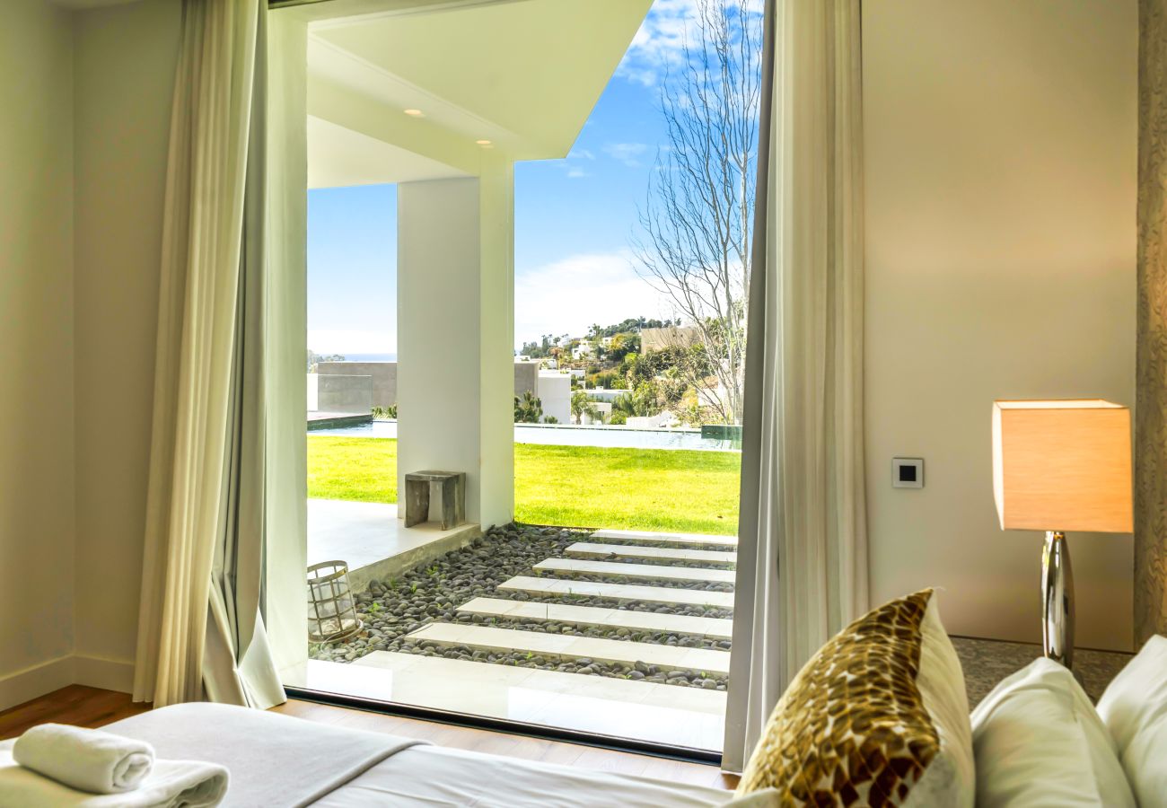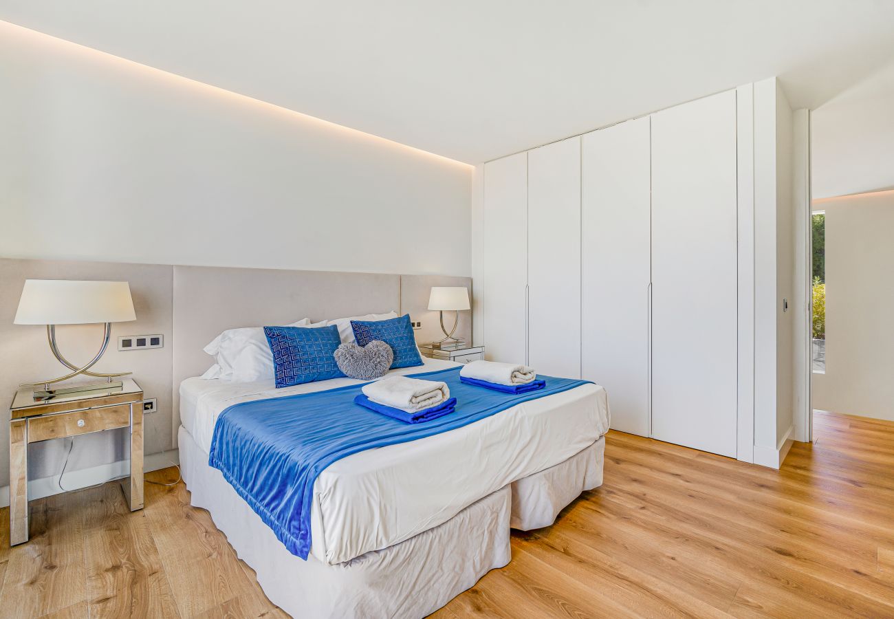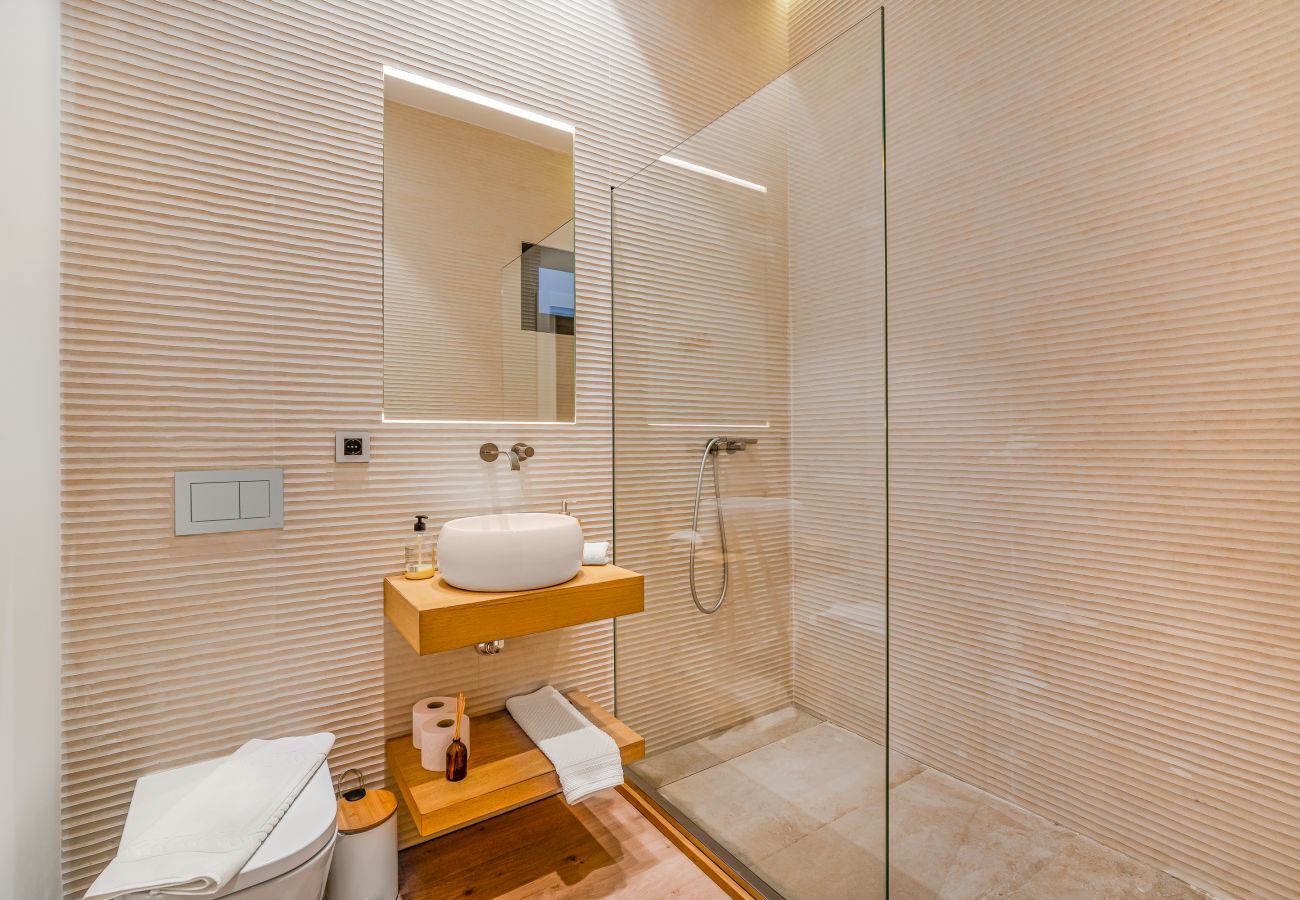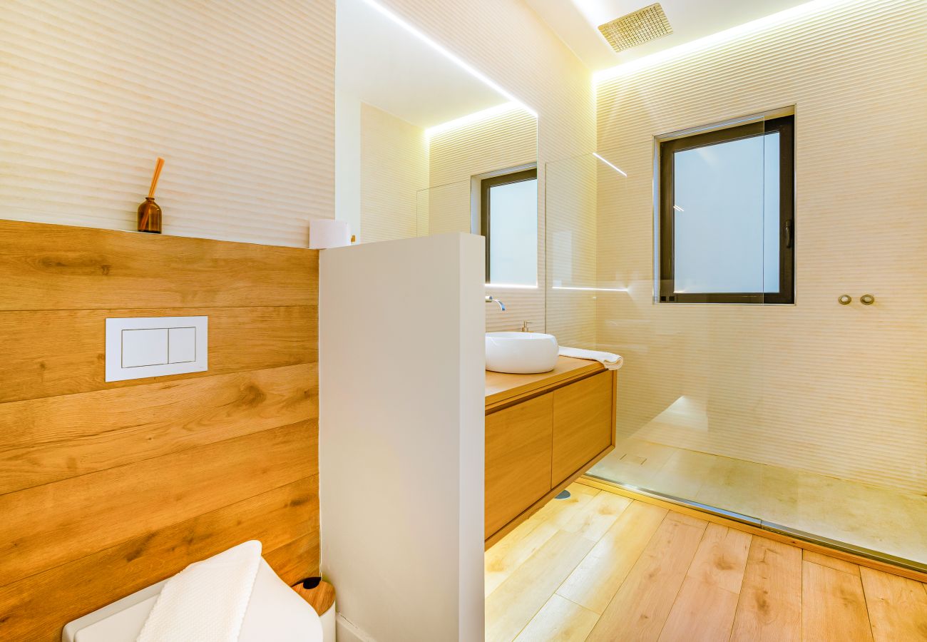 The upper floor is home to the luxurious master suite and two further guest bedrooms, all featuring walk-in wardrobes and dressing areas. A shared, well-appointed bathroom serves the guest rooms. Each bedroom has direct access to a panoramic terrace that spans the length of the villa—perfect for unwinding in the jacuzzi or refreshing in the outdoor shower while taking in the stunning scenery.