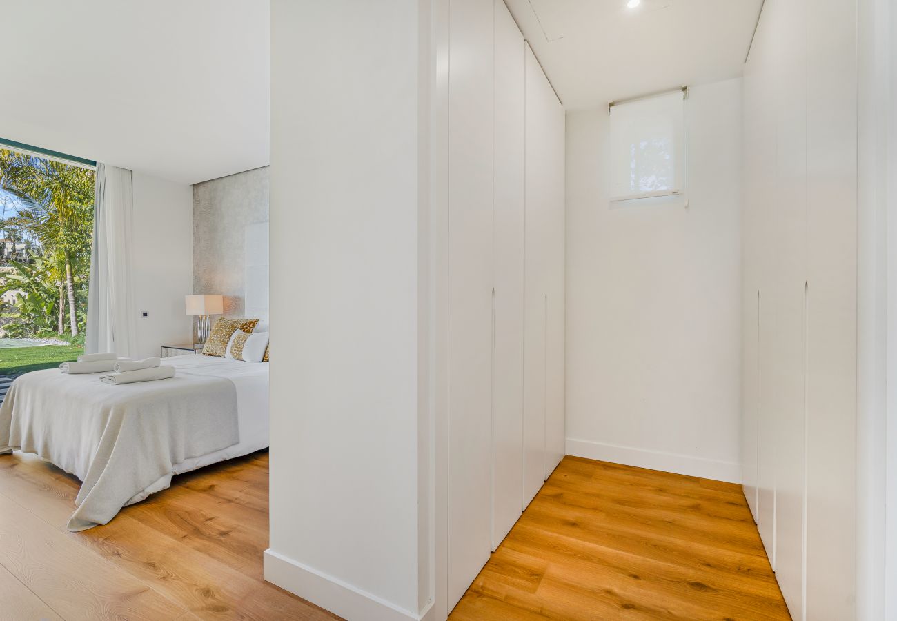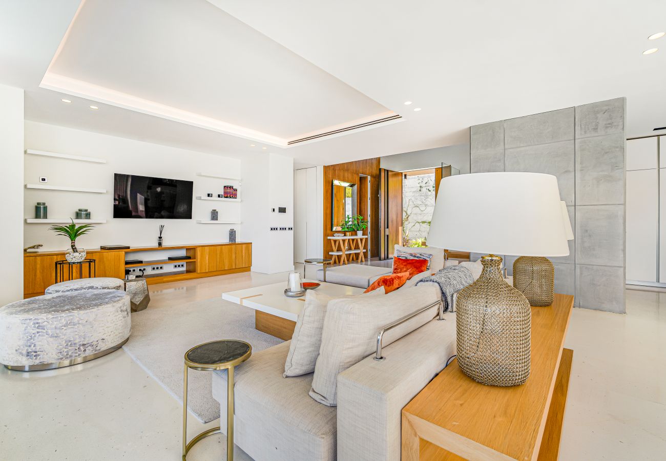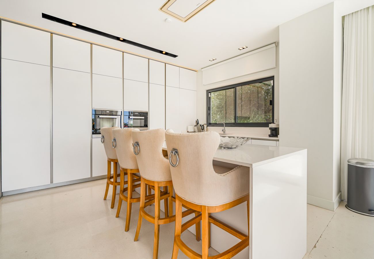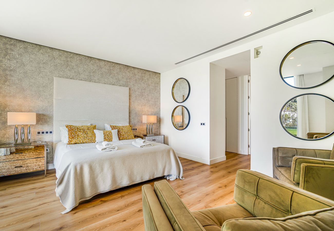 Designed with contemporary elegance and finished to impeccable standards, the villa welcomes guests with a bright, open-plan living space. Expansive sliding doors flood the area with natural light and lead out to a private terrace and beautifully maintained gardens. The space flows effortlessly into a sleek, fully equipped kitchen and a stylish dining area that comfortably seats eight. A spacious guest suite with a king-size bed and a separate guest cloakroom also occupy the ground level.