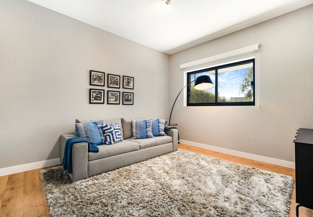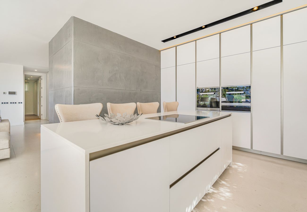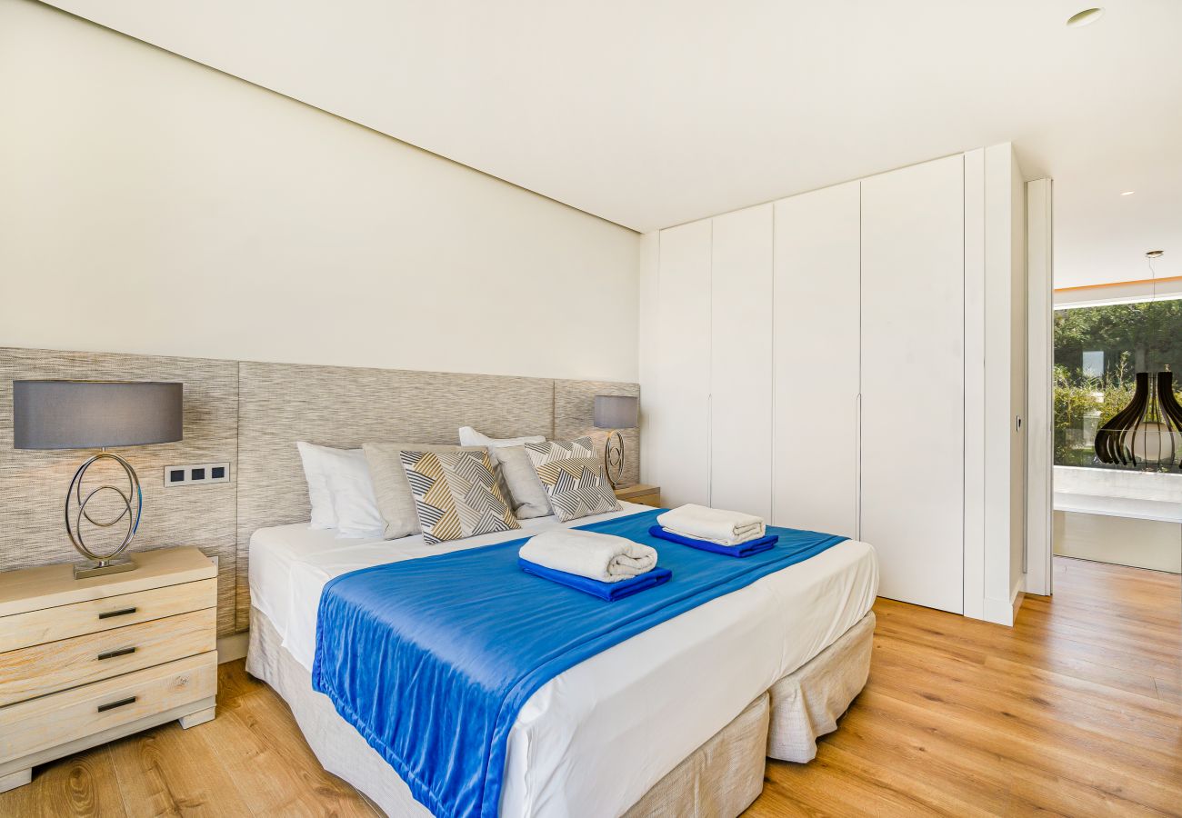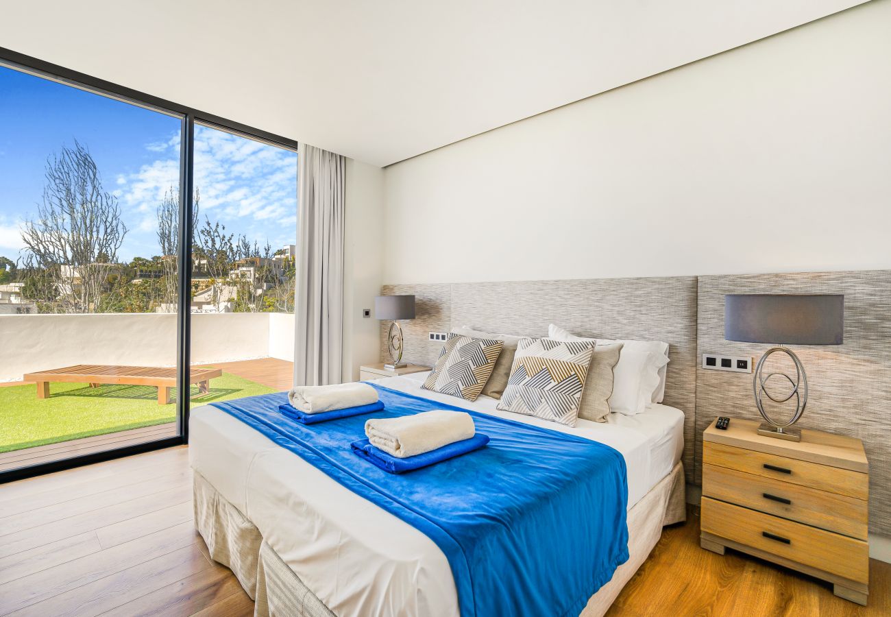 Designed with contemporary elegance and finished to impeccable standards, the villa welcomes guests with a bright, open-plan living space. Expansive sliding doors flood the area with natural light and lead out to a private terrace and beautifully maintained gardens. The space flows effortlessly into a sleek, fully equipped kitchen and a stylish dining area that comfortably seats eight. A spacious guest suite with a king-size bed and a separate guest cloakroom also occupy the ground level.