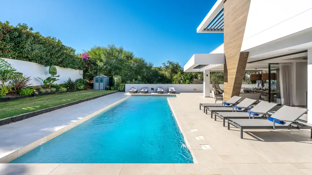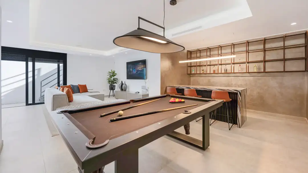 Inside, the villa comfortably hosts up to 12 guests across five serene bedrooms. The bright, spacious living area flows seamlessly into a fully equipped kitchen, well-suited for everything from morning coffee to private chef dinners. On the lower level, a stylish leisure space offers a bar, billiard table and a cosy cinema corner for relaxed evenings after a day at the beach. The villa is fully equipped for convenience and comfort, including fibre-optic high-speed Wi-Fi, climate control throughout, private parking, and pet-friendly accommodation (up to 10kg).