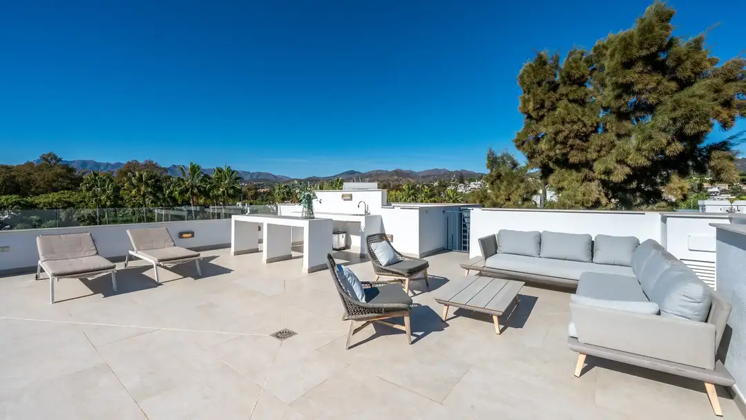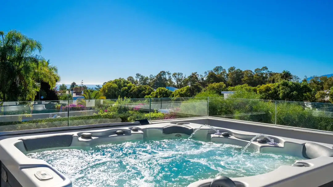 Outdoors, Villa Valentino is newly finished and thoughtfully designed for open-air living. Expansive sun-soaked terraces invite relaxed dining and leisurely gatherings, complemented by a high-end BBQ area ideal for long lunches that linger into sunset. A private heated pool forms the centrepiece of the outdoor space and includes a safety cover for families with young children. Above, the rooftop terrace features a hot tub overlooking the sea, creating the perfect setting for evening unwinding under the sky.